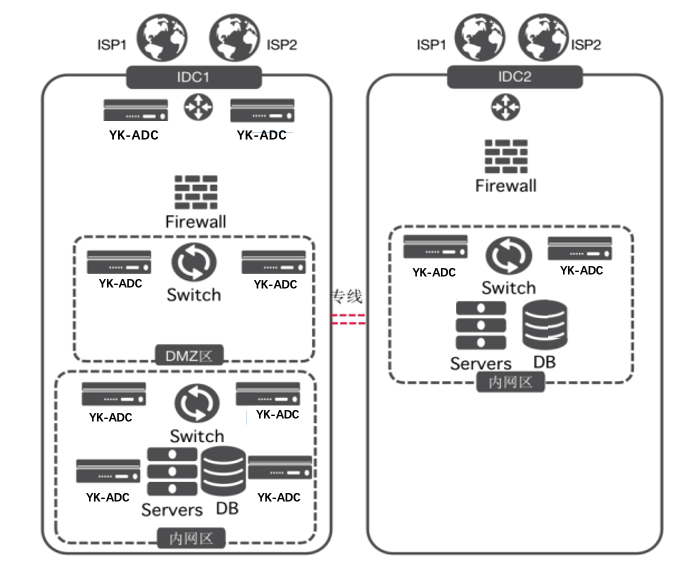 3、內(nèi)網(wǎng)采用YK-ADC的RHI+OSPF和集群技術(shù),做到IP架構(gòu)的雙中心雙活應(yīng)用調(diào)度