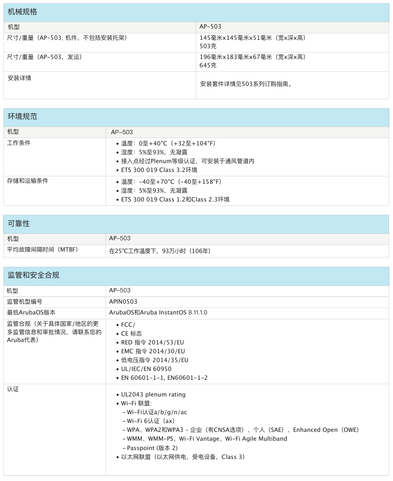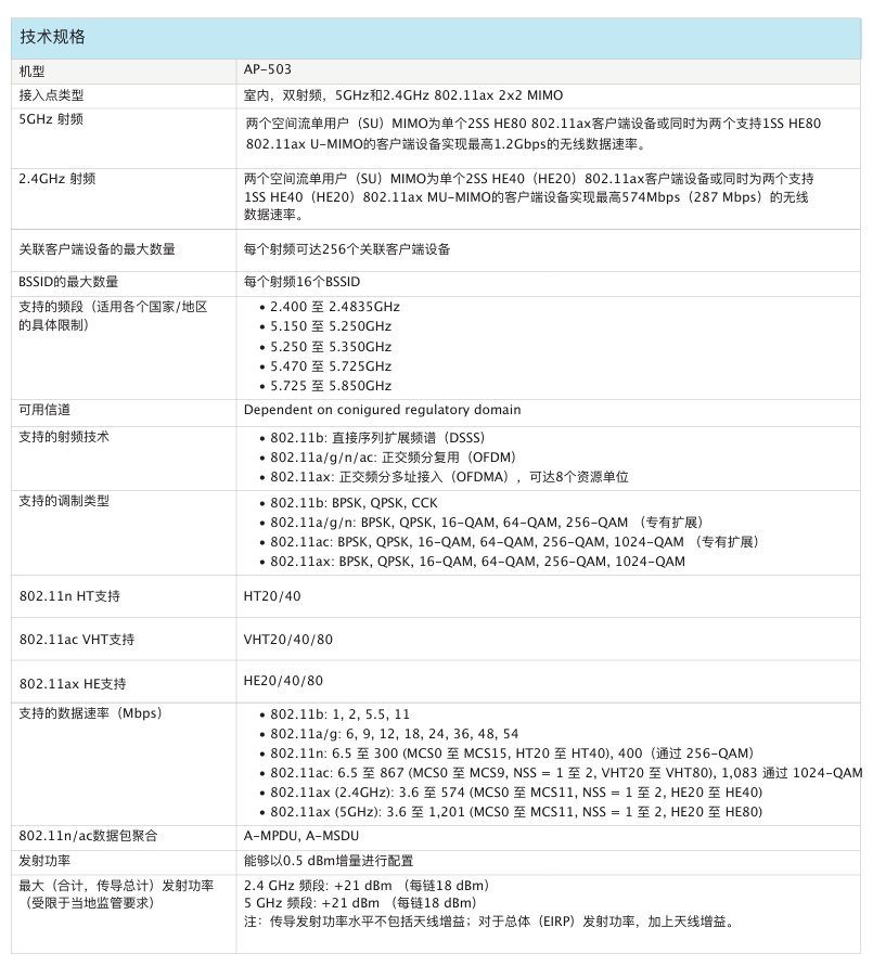 室內中密度Wi-Fi 6接入點AP-503提供兼具高成本效益與高性能的連接,可以幫助各類組織應對因移動使用需求提高、轉向云或物聯網環境而帶來的設備增長挑戰。503 系列的實際聚合數據速率高達 1.775 Gbps(HE80/HE40),可以為學校、中型辦公室和零售賣場等中等密度的場地和工作場所提供所需的連接速度和可靠性。