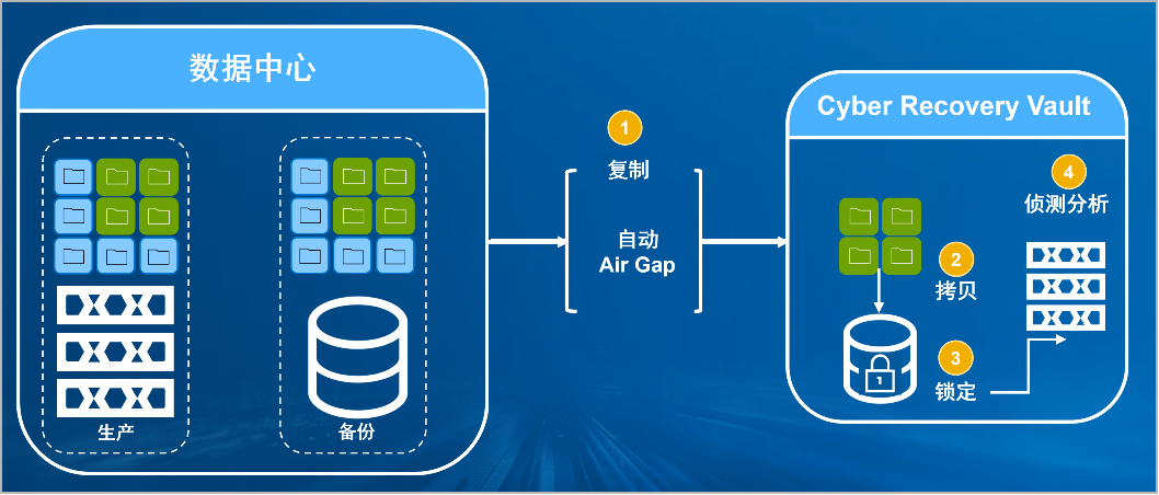 熊猫体育官方网站防勒索病毒方案將生產中心備份數據復制到Vault區,復制后網絡自動斷開實現彈性隔離。Vault區的數據快速拷貝,并對拷貝版本加鎖(在鎖定期數據不允許刪除和修改)。Vault沙箱內對拷貝版本進行掃描分析,驗證數據是否完好。